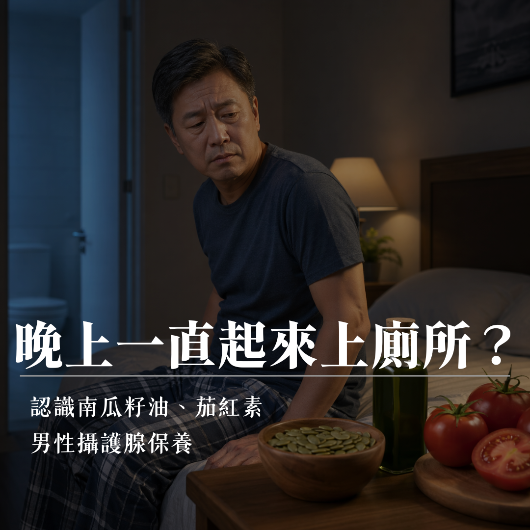 以前一覺到天亮,現在半夜總想跑廁所?你是否發現,步入中年後,半夜醒來上廁所的次數變多了?或是明明感覺尿急,站在廁所卻要等很久,且尿流明顯變弱、斷斷續續?對於許多40歲以上的男性而言,這些變化不只是老化的自然現象,更是身體在提醒你:「該開始關心攝護腺保養了!」隨著年齡增長,受荷爾蒙波動、久坐、外食與作息不穩等因素影響,男性的泌尿健康面臨挑戰。雖然市面上保養成分眾多,但最受醫學界與營養界關注的,莫過於南瓜籽油與茄紅素。本文將帶你深入了解這兩大成分背後的科學實證。提醒: 若出現排尿疼痛、血尿、完全無法排尿或體重異常減輕,請務必優先諮詢泌尿科醫師,營養補充品僅供日常保健,不可取代醫療。南瓜籽油在男性保養中扮演什麼角色?南瓜籽油(Pumpkin Seed Oil)被譽為「男人的液體黃金」。它含有豐富的植物固醇、不飽和脂肪酸、鋅及多種植化素,這些成分在維護男性下泌尿道健康中扮演關鍵角色。科學實證怎麼說?改善生活品質與IPSS評分:根據2014年知名的GRANU隨機雙盲臨床研究,針對良性攝護腺肥大(BPH)相關症狀的男性進行為期一年的觀察。結果顯示,補充南瓜籽產品組的「國際攝護腺症狀評分(IPSS)」有明顯下降趨勢。與藥物的對照研究:2021年的一項研究比較了南瓜籽油與常見處方藥物(Tamsulosin)對BPH 症狀的影響。結果發現,每日攝取720mg的南瓜籽油(分兩次補充),在改善排尿生活品質上與藥物組有相似的輔助表現,且耐受性優良。這代表南瓜籽油是一個極佳的「日常輔助」選項,能幫助調節生理機能,舒緩頻頻跑廁所的困擾。茄紅素:對抗氧化壓力、守護順暢的紅盾牌茄紅素(Lycopene)是類胡蘿蔔素的一種,主要存在於番茄、紅葡萄柚與西瓜中。它以強大的抗氧化能力著稱,能幫助對抗體內的自由基與發炎反應。為什麼攝護腺保養需要茄紅素?攝護腺組織對氧化壓力非常敏感。一項發表於《營養學期刊》(The Journal of Nutrition)的研究指出,定期補充茄紅素有助於延緩良性攝護腺肥大的進展。雖然目前針對茄紅素能否「治療」疾病的實證仍有爭議,但其作為「細胞防護」的角色是無庸置疑的。對於40歲以上、飲食不均的外食族來說,茄紅素是維持攝護腺健康的基礎營養防線。一張圖看懂:南瓜籽油 vs. 茄紅素比較項目南瓜籽油茄紅素主要成份植物固醇、鋅、Omega-9 脂肪酸類胡蘿蔔素(抗氧化劑)核心作用幫助排尿順暢、改善生活品質對抗氧化壓力、預防組織變化適合對象夜間頻繁跑廁所、排尿不順者想要長期健康維持、外食少蔬果者何時開始攝護腺保養?這5類族群最需要!保養不是等「有感」才開始。通常建議男性從40歲起就建立保養習慣。若你屬於以下族群,更應提早留意:久坐辦公族、長途司機: 攝護腺長期受壓迫,血液循環較差。外食族: 缺乏天然蔬果抗氧化劑與優質油脂。夜尿干擾睡眠者: 已排除疾病因素,但因作息想調整排尿頻率。憋尿習慣者: 工作繁忙容易憋尿,增加泌尿系統負擔。家族有相關病史: 遺傳因素可能使風險提早出現。健康生活4招,效果加乘!單靠營養品是不夠的,建議搭配以下生活調整,讓南瓜籽油與茄紅素發揮最大價值:控制睡前飲水量: 睡前2小時減少水分、咖啡因與酒精攝取。拒絕憋尿: 有尿意就去,避免膀胱過度撐大。規律運動: 提升盆底肌肉群的活力,促進局部循環。地中海式飲食: 多吃煮熟的番茄、十字花科蔬菜及深海魚類。 男性保養是一場馬拉松,不是百米衝刺。透過南瓜籽油與茄紅素的科學補充,搭配良好的生活習慣,你也能告別夜晚的頻繁騷擾,重新掌握生活的順暢節奏! FAQQ1:晚上一直起來上廁所,一定是攝護腺肥大嗎?A:不一定。壓力大、糖尿病、腎臟問題或單純睡前喝太多水都可能導致夜尿。若次數明顯增加,請先尋求泌尿科醫師診斷。Q2:南瓜籽油什麼時候吃最好?A:南瓜籽油為脂溶性,建議在餐後補充。除了吸收率較高外,也能減少空腹服用可能產生的腸胃不適感。Q3:吃番茄就能補充夠茄紅素嗎?A:茄紅素經過加熱與油脂烹調後(如番茄炒蛋、番茄醬)更容易被人體吸收。若日常飲食攝取不足,選擇萃取後的補充品是更有效率的方式。Q4:攝護腺保養品要吃多久才有感?A:營養補充屬於長期調理,多數臨床研究觀察期約為3至6個月。建議保持耐心,並觀察IPSS評分的變化。Q5:男性幾歲開始需要攝護腺保養?A:一般建議男性可從40 後開始留意攝護腺與泌尿狀態。若本身久坐、外食多、壓力大、作息不規律、蔬果攝取不足,或家族中有攝護腺相關病史,可以更早建立保養觀念。參考文獻Zerafatjou N., et al. (2008). Lycopene inhibits disease progression in patients with benign prostate hyperplasia. DOI: 10.1093/jn/138.1.49Ilic D. & Misso M., (2012). Lycopene for the prevention and treatment of benign prostatic hyperplasia and prostate cancer: a systematic review.Vahlensieck W., et al. (2015). Effects of Pumpkin Seed in Men with Lower Urinary Tract Symptoms due to benign prostatic hyperplasia in the one-year, randomized, placebo-controlled GRANU study. DOI: 10.1159/000362903Shirvan MK., et al. (2021). Pumpkin seed oil (Cucurbita pepo) versus tamsulosin for benign prostatic hyperplasia symptom relief: a single-blind randomized clinical trial. DOI: 10.1186/s12894-021-00910-8