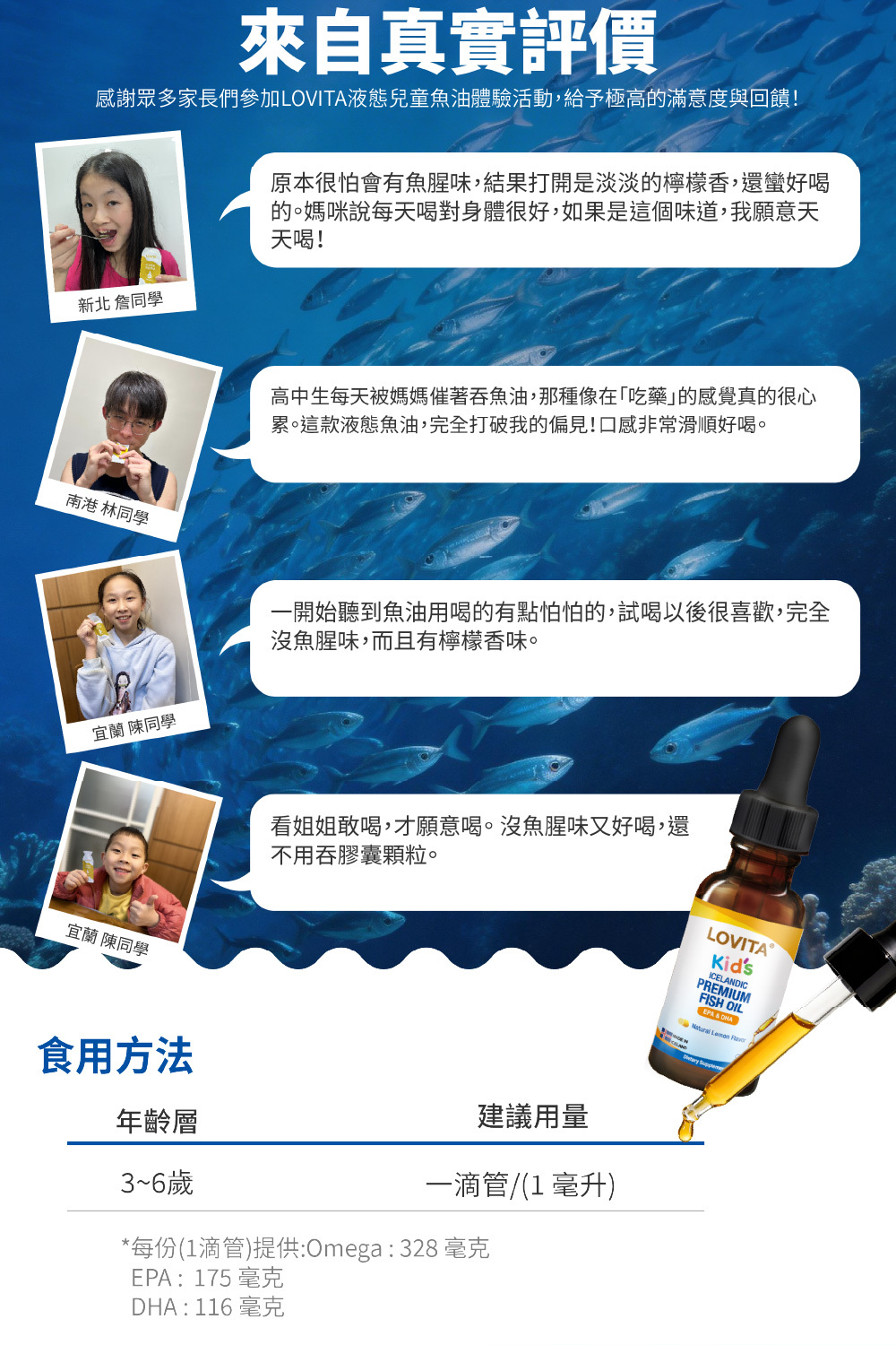 食用方式:3~6歲每日一次,每次一毫升(約1滴管)。隨餐補充。
